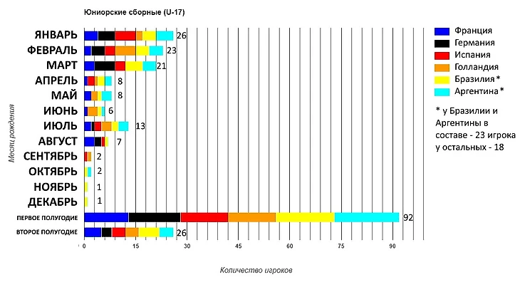 Ситуация становилась все более и более интересной. Сперва может возникнуть мысль о том, что в погоне за результатом российским игрокам просто неумело переписывают дату рождения. Но нет – ситуация с поголовным доминированием подростков, родившихся в первой половине года повторяется и в сборных других государств: Франция, Германия, Голландия, Испания, Бразилия, Аргентина – в заявках юношей этих стран преобладают игроки, родившиеся в первых трех месяцах нового года, а пацаны, рожденные во второй половине года находятся в абсолютном меньшинстве: