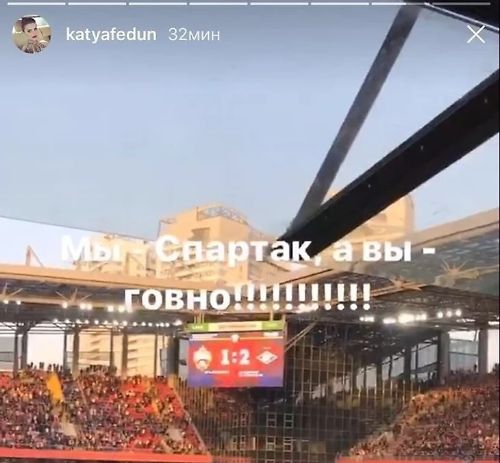 После того, как счет стал 2:1 в пользу красно-белых девушка опубликовала в инстаграме фотографию с матча, на которой была надпись: «Мы «Спартак», а вы – говно», сообщает LIFE.ru.