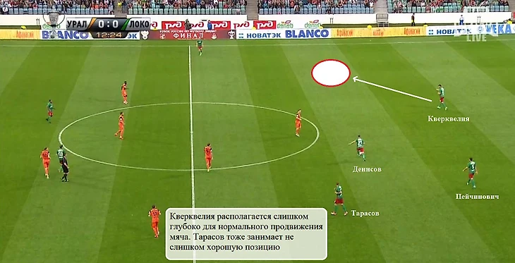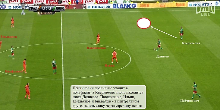 При начале атаки Игорь Денисов любит опускаться к своим воротам ближе форвардов соперника. При схеме с тремя центральными защитниками это не слишком целесообразно, поскольку у «Локомотива» и так есть игроки, способные отдать первую передачу (Пейчинович, Кверквелия). С «Уралом» Семин выставил двух центральных защитников, но проблемы при смещениях Денисова вглубь сохранились. Причина – слишком узкое расположение Пейчиновича и Кверквелии, не позволяющее растягивать переднюю линию екатеринбуржцев.