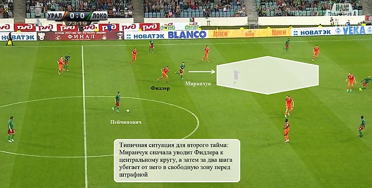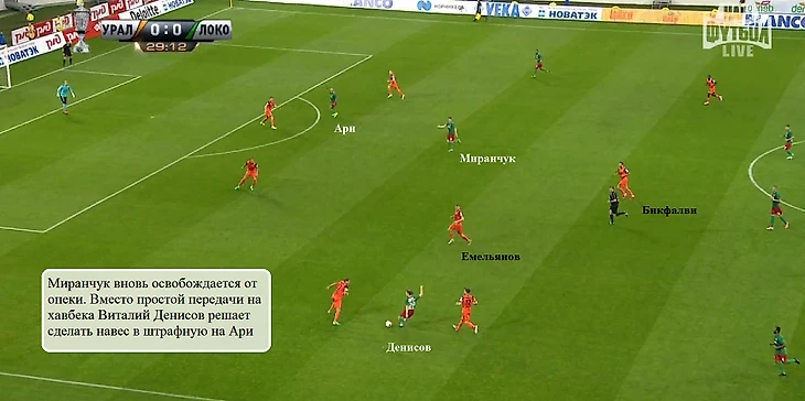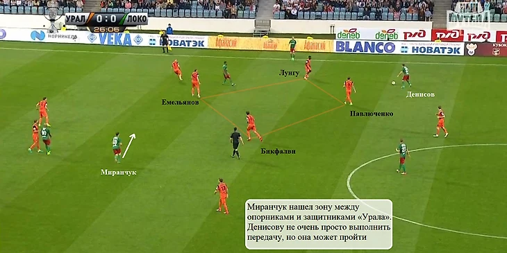 Несмотря на хорошую позиционную игру Емельянова и Бикфалви несколько раз Миранчуку все же удавалось находить свободные зоны перед линией обороны «Урала». В таких эпизодах трудность заключалась в доставке мяча хавбеку – порой продвижение мяча через него было не самым очевидным вариантом продолжения атаки: