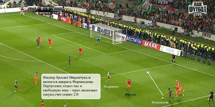 В первом тайме опорники «Урала» редко поднимались к центральному кругу при атаках «Локомотива». Фидлер это делал постоянно, и из-за не самых лучших скоростных качеств Артем не успевал вернуться на свою позицию.