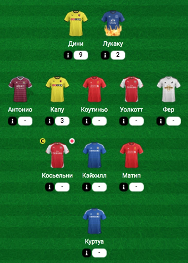 Тут мы видим, по меньшей мере очень нестандартного капитана, и 6 нестандартных выборов, которых мы отнесем к джокерам (Матип, Кейхилл, Фер, Капу, Дини, Косьельни). Не делайте так :)