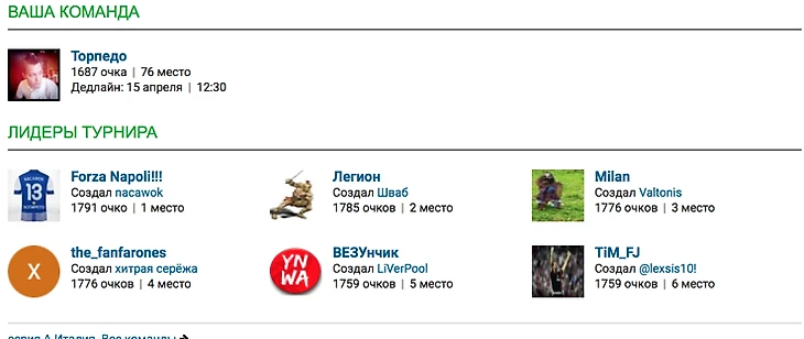 7FR (Fantacyracing)- тоже очень хороший рейтинг, его плюсы в том, что вы можете смотреть свое положение относительно остальных игроков по любой сумме разных чемпионатов, это удобно в том случае, если вы играете не все чемпионаты. Но ЛЧ и ЛЕ он не учитывает, в принципе.