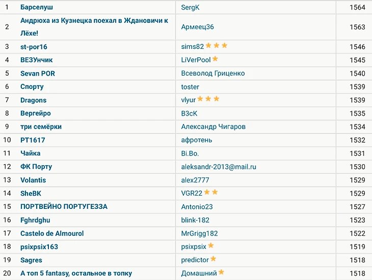 И раз уж мы заговорили про удачу и везение в фентези, то хочу высказаться на этот счет. Знаю, что очень многие топовые игроки считают, что удача имеет очень сильное влияние на фентези, вплоть до 50%. Я думаю иначе, уверен, что играя по ОФС удача может корректировать ваши результаты не более чем процентов на 20. То есть она безусловно влияет на результаты, но определяющей не является, вот например посмотрите на текущий топ-50 в Португалии (за 10 туров до конца). Там играет почти 3000 человек, но в топ-20 8 человек, у которых за плечами уже есть победы(!) в фентези-турнирах, да еще и по несколько (Аремеец36 также имеет звезду но на втором аккаунте).
