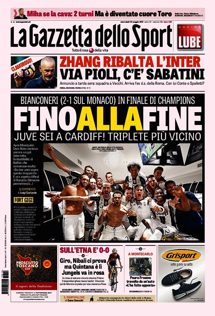 Бьянконери (2:1 против «Монако») в финале Лиги Чемпионов. «Юве», ты в Кардиффе! Триплет всё ближе. Счёт открыл Манджукич, Дани Алвес всё решил: снова гол. Прервана сухая серия Буффона, который, однако, ликует: «В течение двух лет мечтал об этой цели». И теперь ожидается «Реал» Роналду (Симеоне позволяет…).