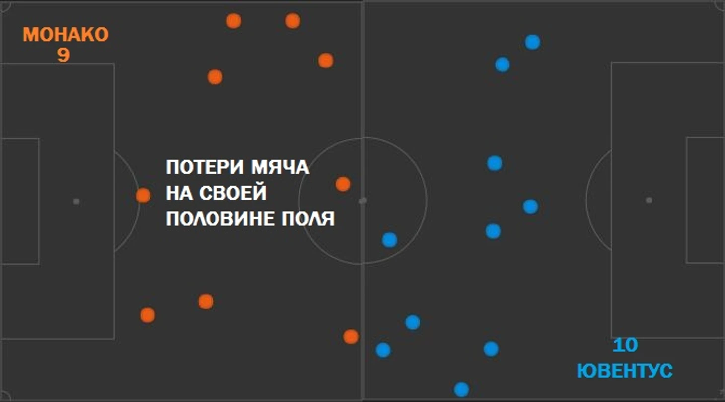 Движение «Ювентуса» при переходе из обороны в атаку помогает разбить прессинг монегасков. То, из-за чего и «Манчестер Сити», и дортмундская «Боруссия» не смогли пройти «Монако», было превосходно использовано «Ювентусом». Отметим, что хозяева играли персонально по каждому игроку, и за счет этого довольно часто получали мяч на большом расстоянии от своих ворот.