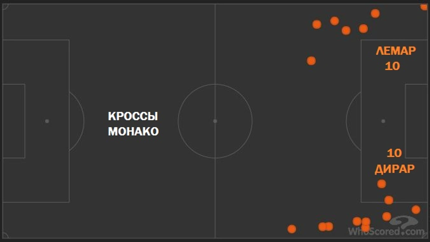 Монегаски столкнулись с лучшей обороной Европы (два пропущенных за весь розыгрыш ЛЧ и серия из 621 минуты подряд без голов с свои ворота в турнире), и им пришлось перейти на кроссы (35 – для сравнения, у «Юве» набралось 15 при активной работе обоих латералей).