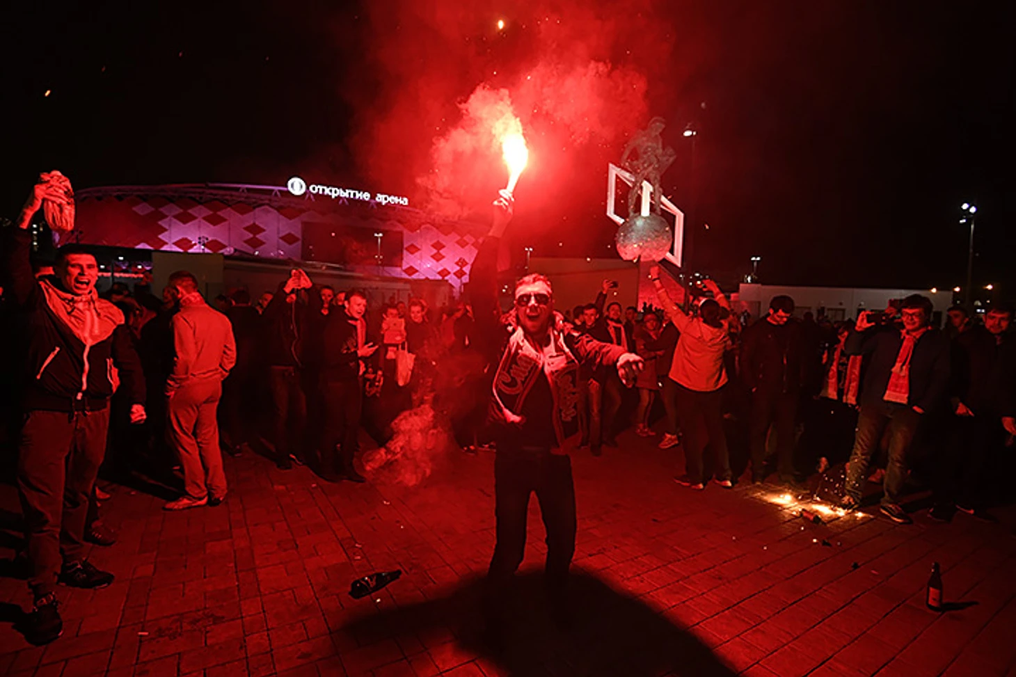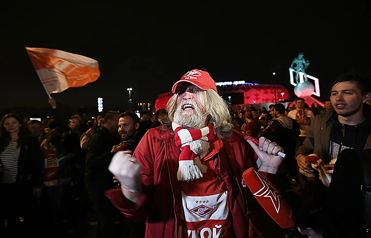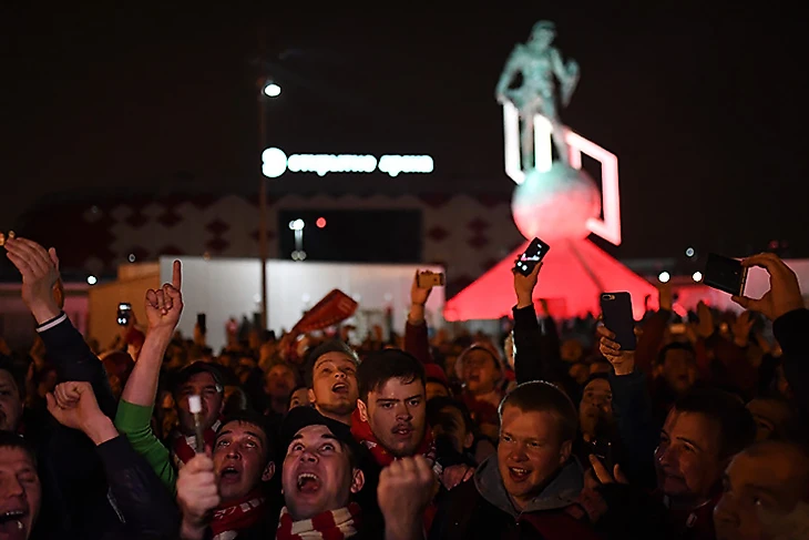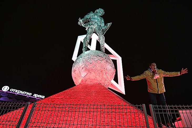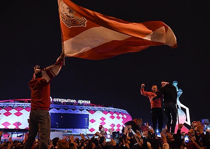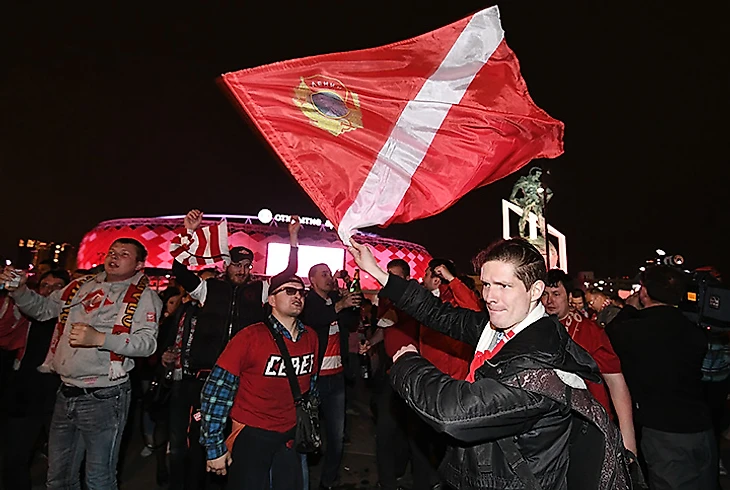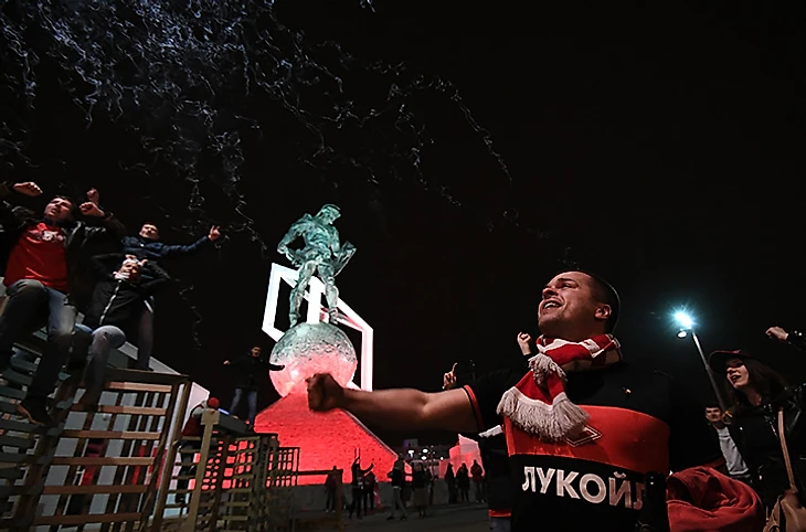 Сегодня вечером капитан «Спартака» Денис Глушаков праздновал победу в чемпионате у домашнего стадиона. Игрок и болельщики клуба собрались у памятника гладиатору рядом с «Открытие Ареной».