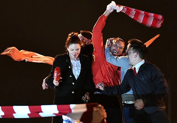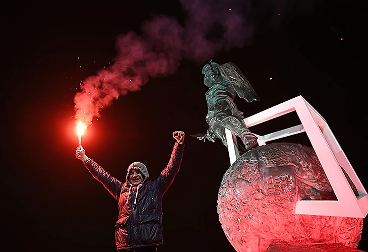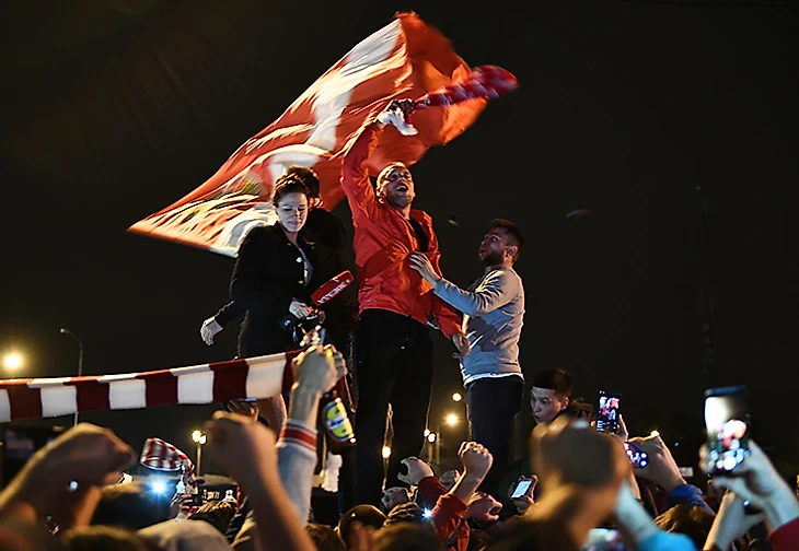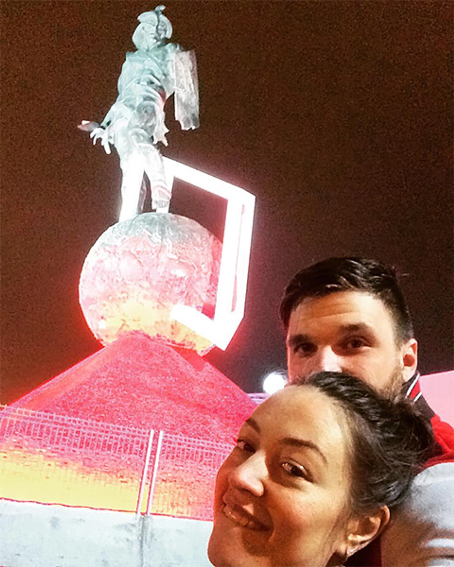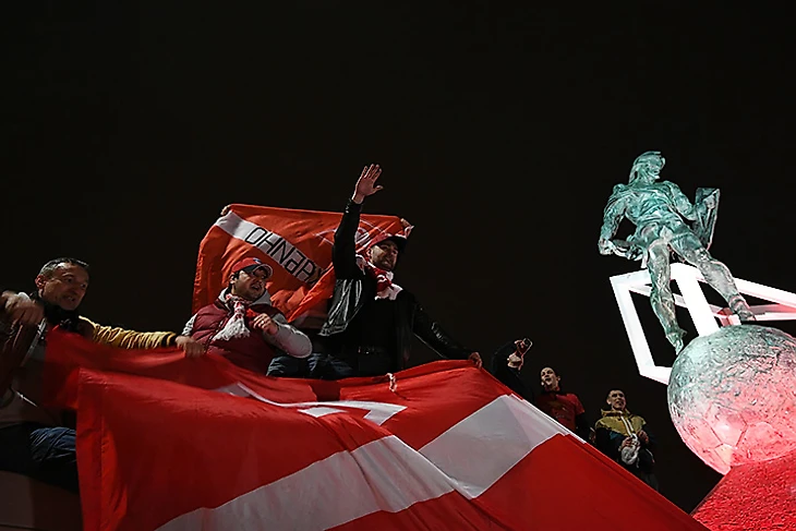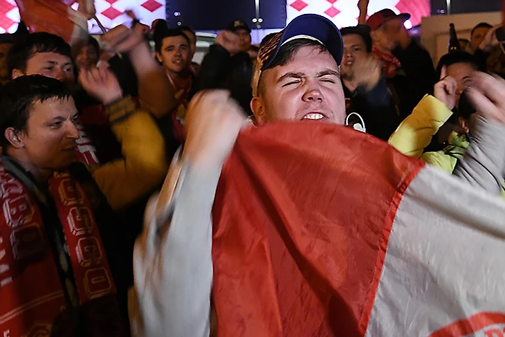 Сегодня вечером капитан «Спартака» Денис Глушаков праздновал победу в чемпионате у домашнего стадиона. Игрок и болельщики клуба собрались у памятника гладиатору рядом с «Открытие Ареной».