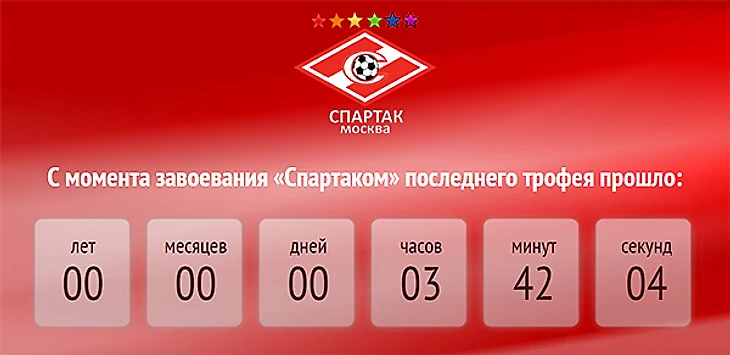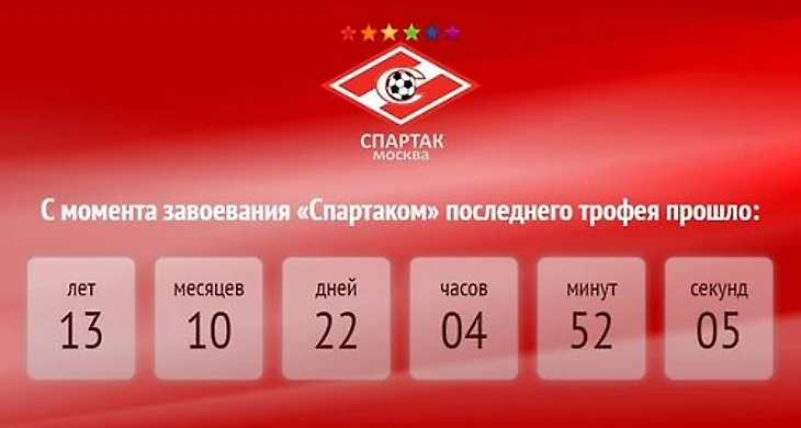 Когда «Спартак» стал чемпионом, все пошли на сайт Спартак-без-титулов.ру, на котором работает самый известный счетчик российского футбола. 13 лет, 10 месяцев, 22 дня и 4 часа – все знают, что это про последний красно-белый трофей в истории. Кубок России-2003.