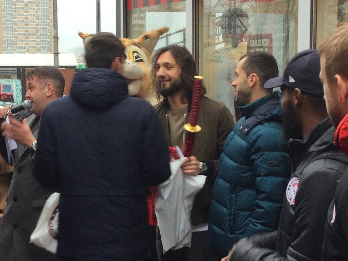 Янушу Голу торжественно вручили майку с цифрой «сто» - по числу матчей, которые он провел в составе «Амкара». А наш бесстрашный мушкетер Дарко Бодул, ставший игроком апреля по версии болельщиков, получил необычный приз – почти настоящую японскую катану. Это – круче, чем шпага или рапира: и для соперника поопаснее будет, да и поэкзотичнее. К тому же – почти амкаровских цветов вещица.