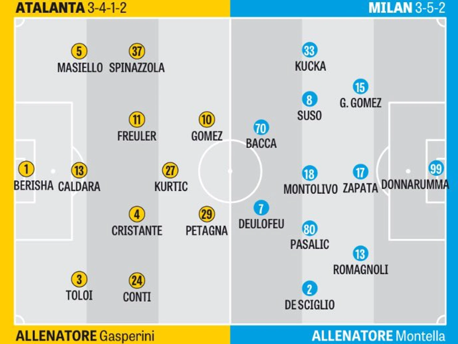 Также Монтелла рассказал о возможном появлении в стартовом составе Риккардо Монтоливо, которое может стать для игрока первым выходом на поле в рамках Серии А после долгого восстановления от тяжелой травмы, полученной в матче сборных Италии и Испании в октябре после столкновения с Серхио Рамосом.