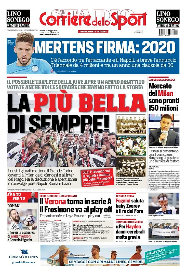 Возможная Триплета «Юве» открывает широкую дискуссию. Голосуйте также вы за команду, которая творит историю. Наше жюри ставят Гранде «Торино» перед «Миланом» голландцев и «Интером» Маго. Но дискуссия открыта и включает в себя также «Наполи», «Рому» и «Лацио».