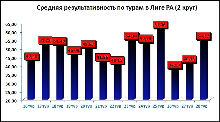 Средняя результативность 28-го тура в Лиге РА - 54,3 очка на команду