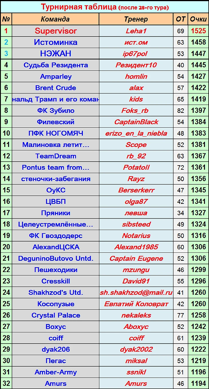 Лидер Чемпионата ФФ - команда "Supervisor" (тренер - Алексей Leha1) - 1525 очков!!!
