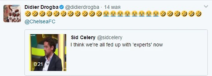Бывший нападающий «Челси» Дидье Дрогба после победы клуба в чемпионате Англии опубликовал в своём «твиттере» набор смайликов, посмеявшись над прогнозами бывших футболистов «Манчестер Юнайтед» Пола Скоулза, Оуэна Харгривза и Рио Фердинанда.