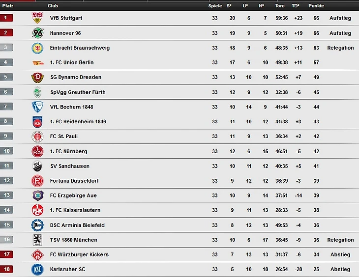 Возвращению "Штутгарта" и "Ганновера" в Бундеслигу мало что может помешать. Таким образом, в случае победы "Гамбурга"/"Вольфсбурга"/"Аугсбурга" в стыковых матчах, состав участников следующего сезона практически полностью повторит состав сезона 2014/15, за исключением того, что вместо "Падерборна" будет играть "РБ". Кому-то из великолепной троицы предстоит играть с еще одним кандидатом на возвращение в Бундеслигу. "Айнтрахт" из Браунвшейга до последнего тура был вторым, но "сгорел" в Билефельде (0:6), что серьезно подпортило еще и разницу мячей. Теперь даже в случае поражения "Штутгарта" или "Ганновера" "егерям" будет непросто создать нужную для себя разницу мячей. К "Айнтрахту" приедет уже вылетевший "Карлсруэ", компанию которому вероятно составит "Вюрцбург". Баварцы отправляются в Штутгарт. В первом круге "Вюрцбург" разгромил соперника (3:0). Эта победа по сей день остается последней для дебютанта второй Бундеслиги. На попадание в стыковые матчи претендуют четыре клуба (теоретически еще и "Фортуна"), наименьшие шансы сыграть с клубом Третьей лиги у "Эрцгебирге".