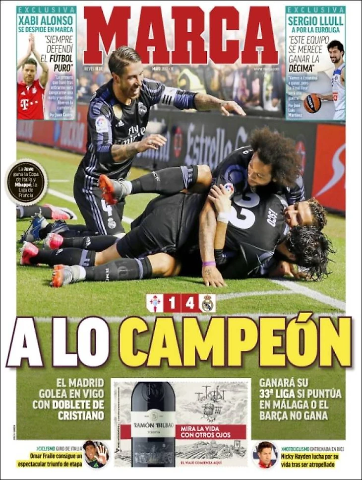 Marca: «К чемпионству! "Реал" выигрывает у "Сельты" благодаря дублю Роналду. В последнем туре им будет достаточно и ничьей с "Малагой", либо ничейного результата "Барсы"