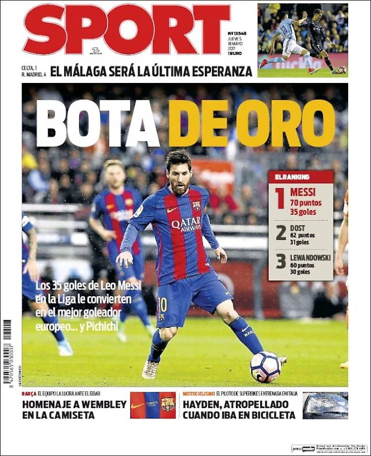 "Золотая бутса: С 35 забитыми мячами Месси станет лучшим бомбардиром европейских чемпионатов... и обладателем "Пичичи". Тройка лидеров: Месси: 70 баллов, 35 голов, Дост: 62 балла, 31 гол, Левандовски: 60 баллов, 30 голов".