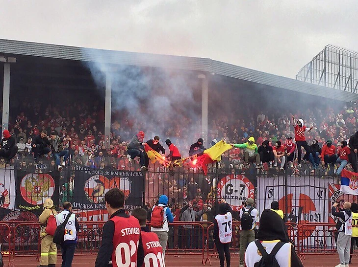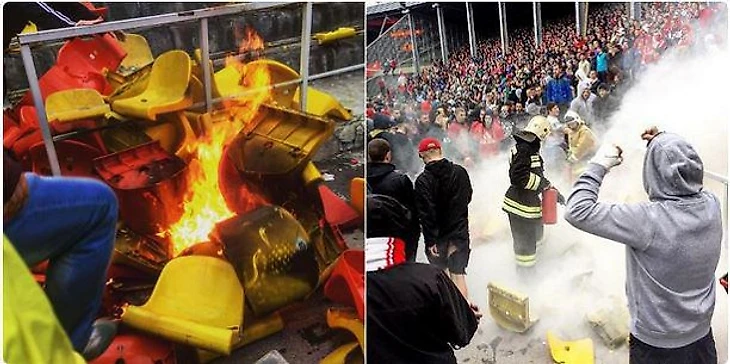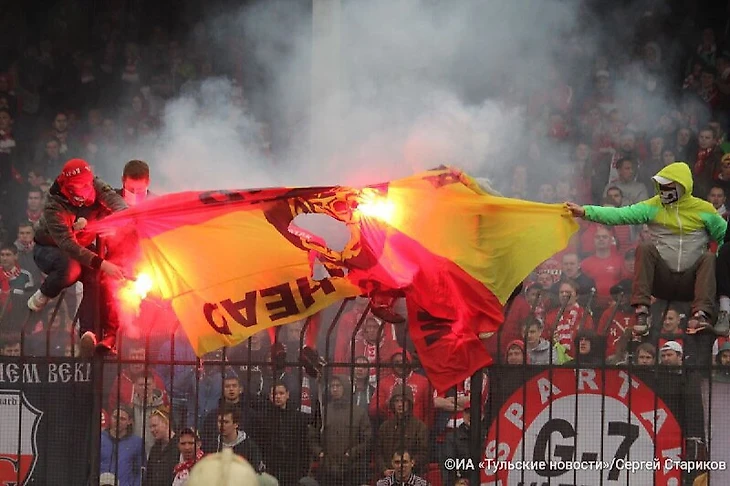 Во время матча против тульского «Арсенала» болельщики «Спартака» устроили пожар на гостевой трибуне, отрывали кресла и бросали их в огонь.