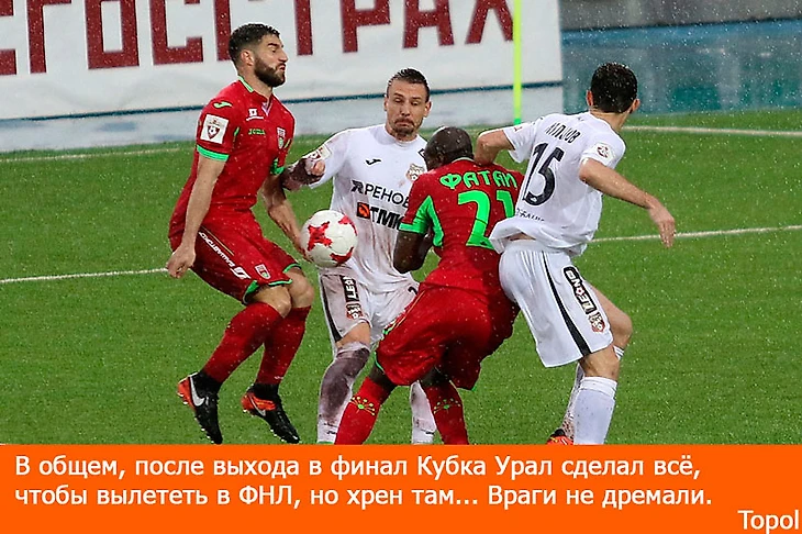 Конец сезона Урал не то чтобы провалил, он его проиграл во что-то отличное от футбола. Отдельно хочется поблагодарить часть команды, которые своим профессионализмом не вызвали нареканий даже в этом десяти матчевом аду. Как только узнал, что вышел в финал кубка, началось "упоение" результатом (плохие, но победные матчи с Томью и Ореном), "опьянение" (поражение мешкам и Спаму), широкий "пьяный жест" (матч с Тереком) и затяжное похмелье (пять матчей без побед, за которые команда не сдвинулась с места). Спасибо всем, кто поучаствовал в "спасении" Урала, хоть большинство из вас играет за другие команды.