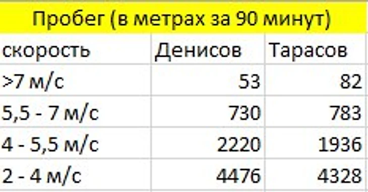 Косвенное подтверждение – фитнесс-статистика. В среднем за 90 минут Денисов пробегает 10,9 км, Тарасов – 10,38. Однако, если посмотреть на пробег на высоких скоростях (>7 м/c и 5,5 – 7 м/c), то Тарасов обходит Денисова по метражу в обоих категориях. Конечно, это не прямое доказательство, а просто еще один факт в пользу теории – более агрессивный стиль вынуждает пробегать больше на рывках (для таких скоростных интервалов разрыв по пробегу достаточный).