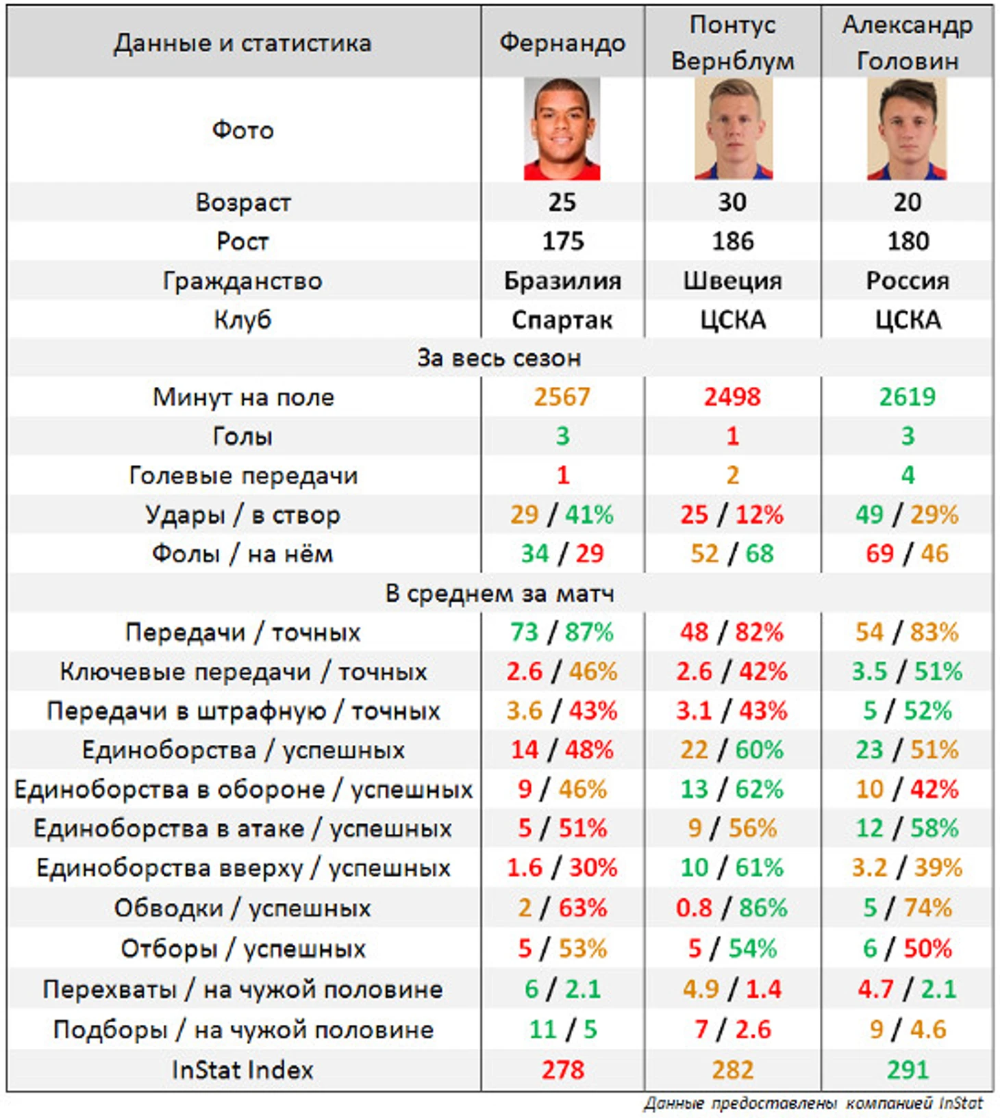 Давайте же сейчас посмотрим на некоторые ключевые статистические показатели Фернандо и сравним их с аналогичными данными по Головину и Вернблуму. С Фернандешем я сопоставлять их не стал, ибо и так слишком много цифр, да и сразу скажу что полузащитник "Локомотива" во многом преуспел именно за счёт атакующих действий (например, гол + пас = 16) - при прочих равных этот момент накидывает много баллов в рейтинг игрока.