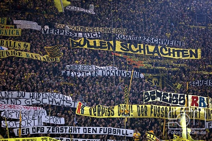 Фанаты дортмундской "Боруссии" сначала избили болельщиков из Лейпцига перед игрой, а на самом матче вывесили 100500 баннеров, направленных против этого клуба:
