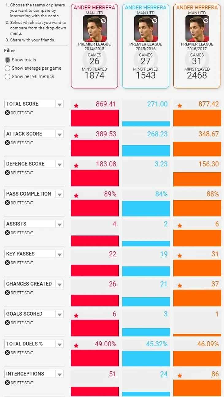 Испанец в этом сезоне просто неудержим. Выжигает газон по обе стороны поля. Но вот что интересно: в своём первом сезоне в «Юнайтед» Андер действовал похожим образом. По статистике, в сезоне 2014/15 Эррера также был довольно активным игроком центра поля. В этом сезоне общие показатели оборонительных действий (особенно перехватов) ещё лучше.