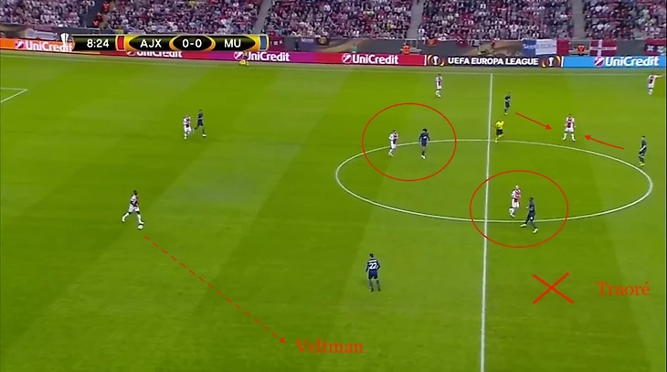 В то же время Мхитарян находится в гибридной позиции: он закрывает пространство для паса на Траоре — который был важным звеном в полуфинале «Аякса» с «Лионом» — и оставляет открытым Велтмана, которого позже будет прессинговать (на втором скриншоте).