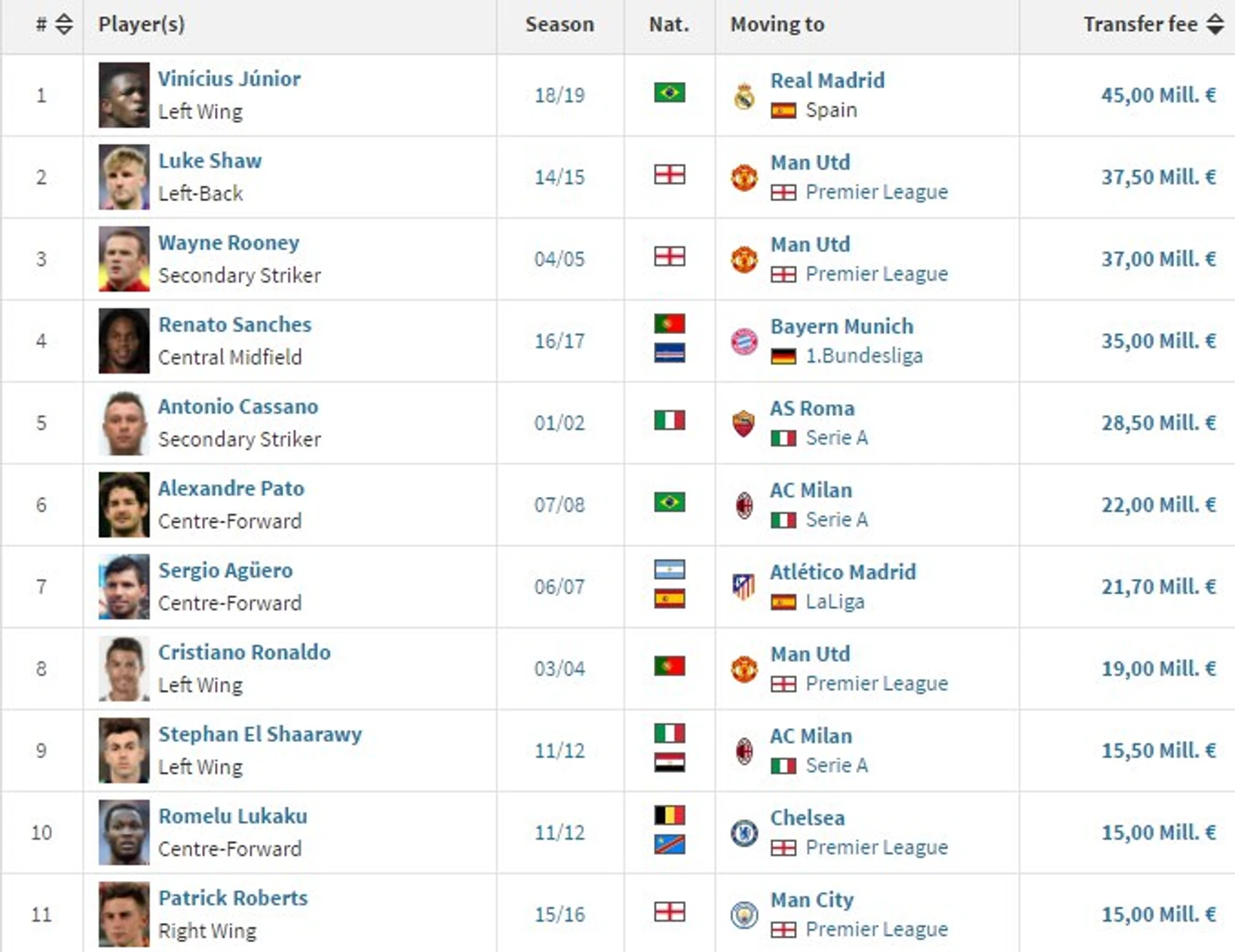Самый дорогой трансфер игрока до 18 лет – 45 миллионов евро