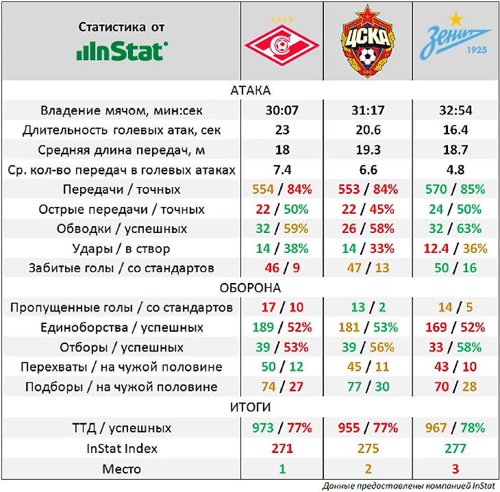 Постепенно заканчивая подводить итоги минувшему чемпионату России по футболу, предлагаю вашему вниманию табличку, в которой отражены ключевые статистические данные трёх лидеров первенства: "Спаратка", ЦСКА и "Зенита".