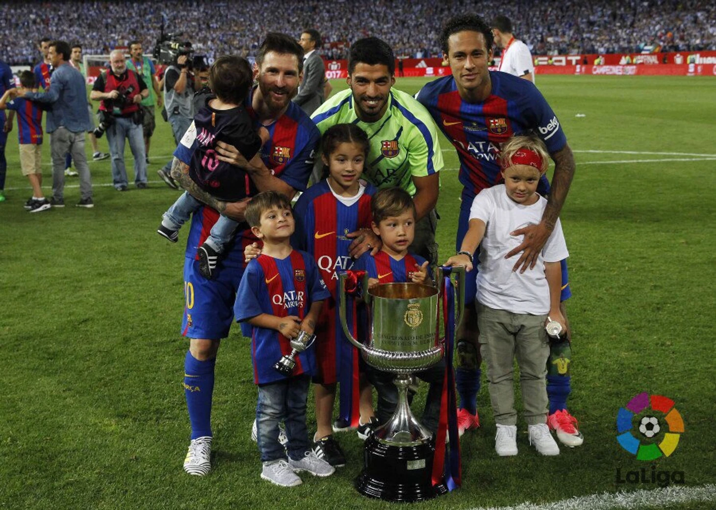 После кубковой победы над "Алавесом" со счетом 3-1 главная атакующая сила Барселоны - трио Месси, Суарес и Неймар сделали памятное фото со своими детьми. Было бы интересно увидеть этих подросших парней в одной команде спустя какое-то время, как считаете? ;)