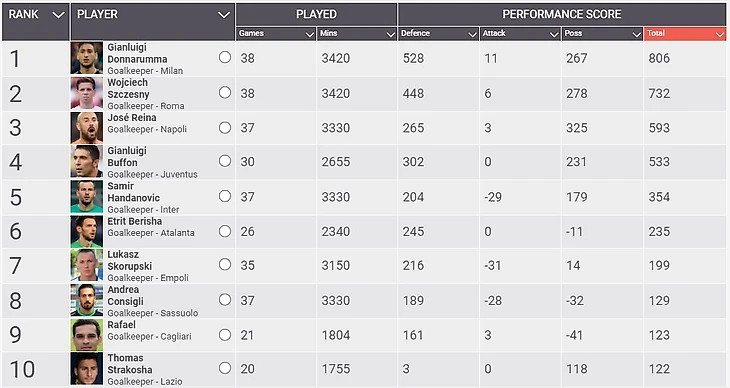 Статистика выступлений в Серии А, согласно сайту squawka подтверждает то, что Шченсны стал одним из самых надёжных голкиперов в Италии: