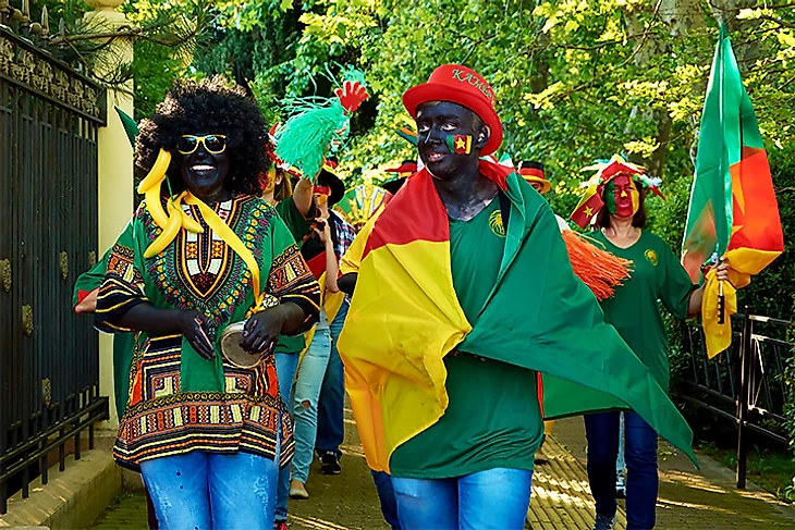 В конце мая и начале июня все были так увлечены возвращением Сергея Фурсенко в «Зенит» и поклонением «Реалу» за Лигу чемпионов, что могли пропустить довольно неловкий момент из Сочи. В конце мая там прошел яркий и массовый городской карнавал – чтобы связать его с наступающим Кубком конфедераций, организаторы нарядили несколько человек в костюмы, ассоциирующиеся со сборными, которые заедут в Сочи хотя бы на один матч. Так родился образ камерунца: футболка сборной, выкрашенное черной краской лицо, черные кудрявые волосы, к телу прицеплена связка бананов.
