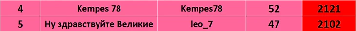 Команды, набравшие в туре 56 и 53 балла соответственно, оккупировали 2 и 3 места. А вот лидер оторвался от тройки преследователей на 25 очков. Поздравляем с победой, weekend offender!