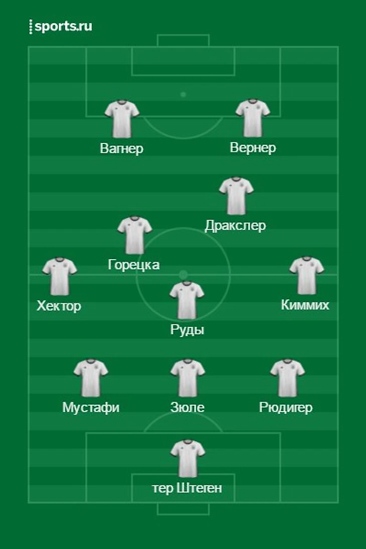 тер Штеген – Рюдигер (Гинтер), Мустафи, Зюле – Руды (Джан, Демме) – Киммих (Хенрихс, Брандт), Хектор (Платтенхардт, Юнес) – Горецка (Демирбай), Дракслер – Вернер (Штиндль), Вагнер