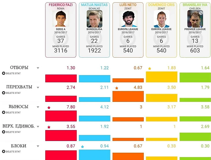 Настасич по статистическим параметрам выглядит словно демо-версия Фасио, но превосходит всех по среднему количеству блоков за матч, что говорит об умении серба занять правильную позицию, да и в принципе, он выглядит по-сильнее своих потенциальных "одноклубников", и ему, в отличие от других, есть куда расти: 24 года для защитника — еще совсем юный возраст.