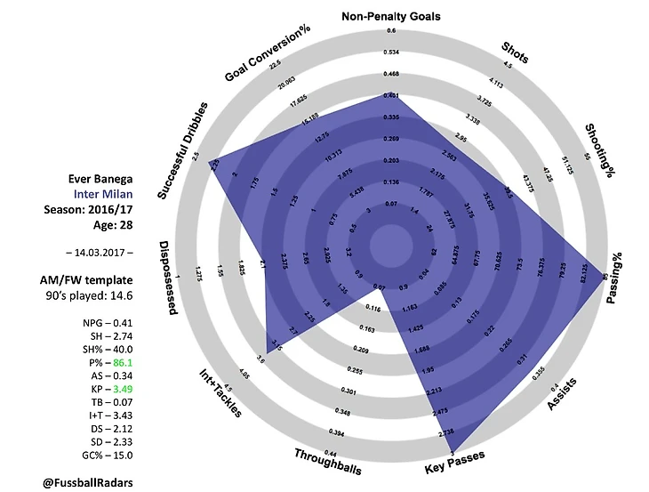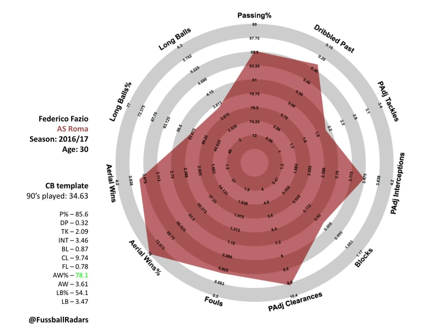 Фасио — прямолинейный, но от того не менее надежный защитник. На его радаре мы видим отличные показатели в оборонительных параметрах: