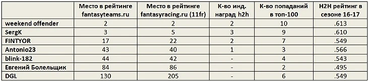 В голосовании за лучшего игрока фэнтези сезона 2016-17 2-место занял SergK, 3-е место weekend offender. Молодцы мужики!