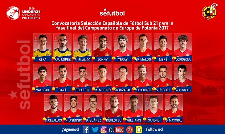 Ровно два года назад сборная Испании до 19 лет выиграла свой чемпионат Европы. Из того состава в нынешней команде до 21 года осталось всего несколько человек: Хесус Вальехо, Дани Себальос, Марко Асенсио, Микель Мерино и Борха Майораль. Пару игроков из того чемпионского состава Альберт Селадес вызывал для того, чтобы они потренировались вместе с командой, пока ведущие игроки находились в своих клубах или были вызваны Хуленом Лопетеги.