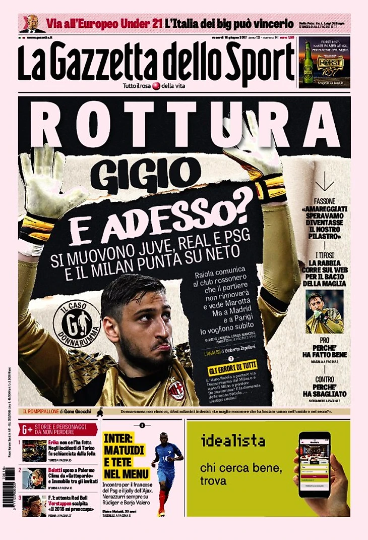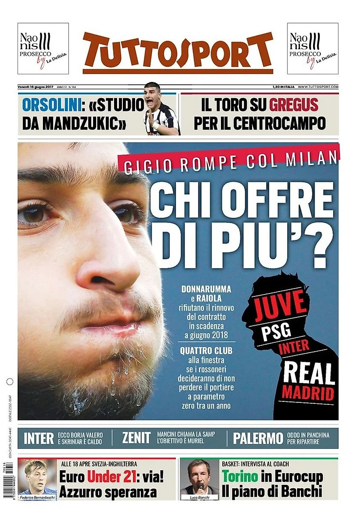 «Юве»? «ПСЖ»? «Интер»? «Реал Мадрид»? Джиджо порвал с «Миланом». Доннарумма и Райола отвергли продление контракта, истекающего в июне 2018 года. Четыре клуба следят за ситуацией, если Россонери решат не терять вратаря бесплатно через год.