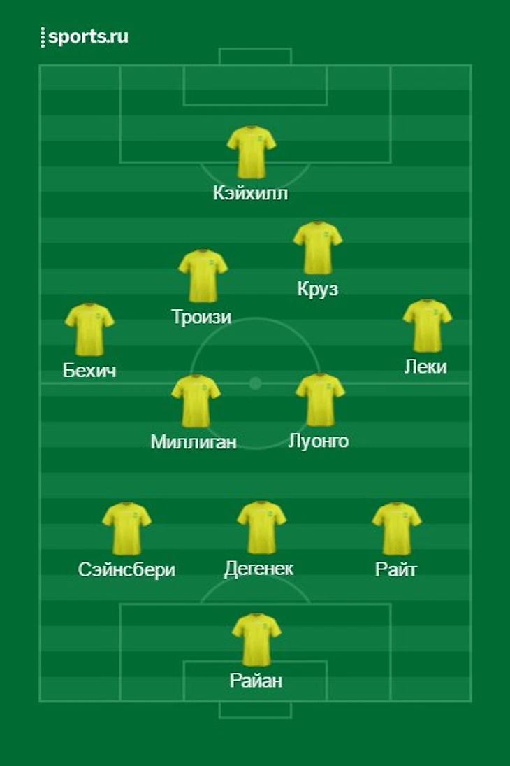Райан (Лангерак) – Райт (Р. Макгоуэн), Дегенек, Сэйнсбери – Леки, Луонго, Миллиган (Ирвин), Бехич (Герсбах) – Круз, Троизи (Муй) – Кэйхилл (Юрич)