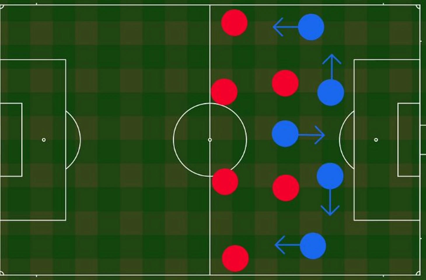 Мяч, в конечном счете, направляется вперед через левого центрбека к полузащитнику, который отошел ко второй линии, чтобы создать некую платформу между звеньями прессинга соперника, после чего мяч отправляется налево, где вырисовывается относительно свободное пространство.