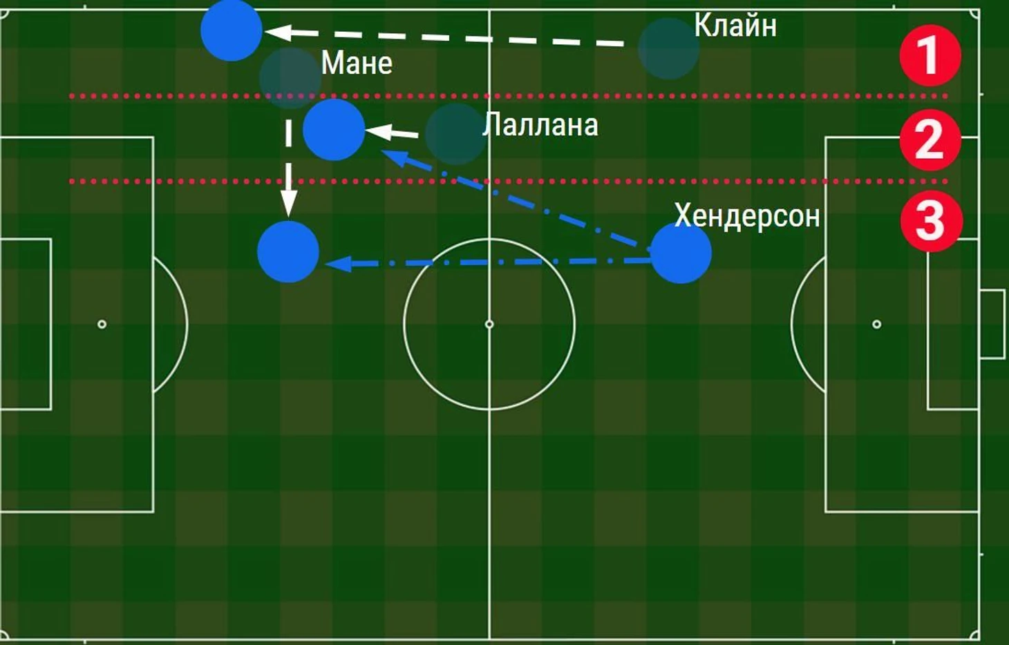 Это простейшая иллюстрация, демонстрирующая ключевые перемещения трех футболистов Клоппа, которые участвуют в ротации на поле в трех определенных "каналах". По мере того, как "Ливерпуль" приближается к финальной трети поля, они будут располагаться в каждом из этих вертикальных участков для максимально удобного взаимодействия.