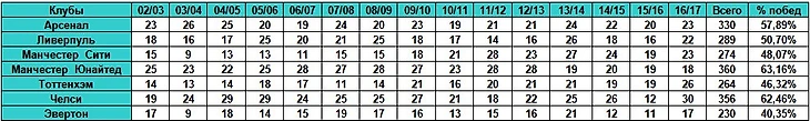 1. «Арсенал», «Манчестер Юнайтед» и «Челси»  одержали более 60% побед за 15 сезонов. Они единственные, кто выиграл более 300 матчей