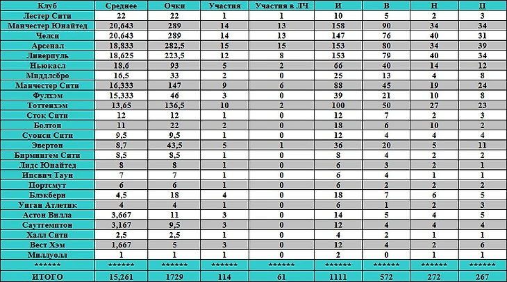 Проанализировав данные, я  пришел к мнению, что лучшим клубом за последние 15 сезонов АПЛ являются сразу два клуба.