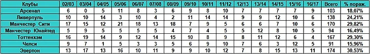 Таблица 5: Количество поражений  в чемпионатах 2002/03-2016/17