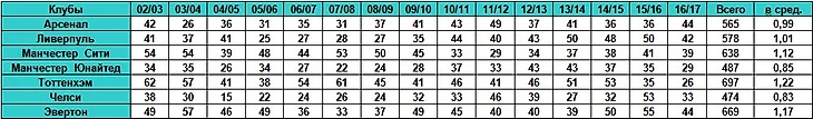 Таблица 6: Количество забитых мячей  в чемпионатах 2002/03-2016/17
