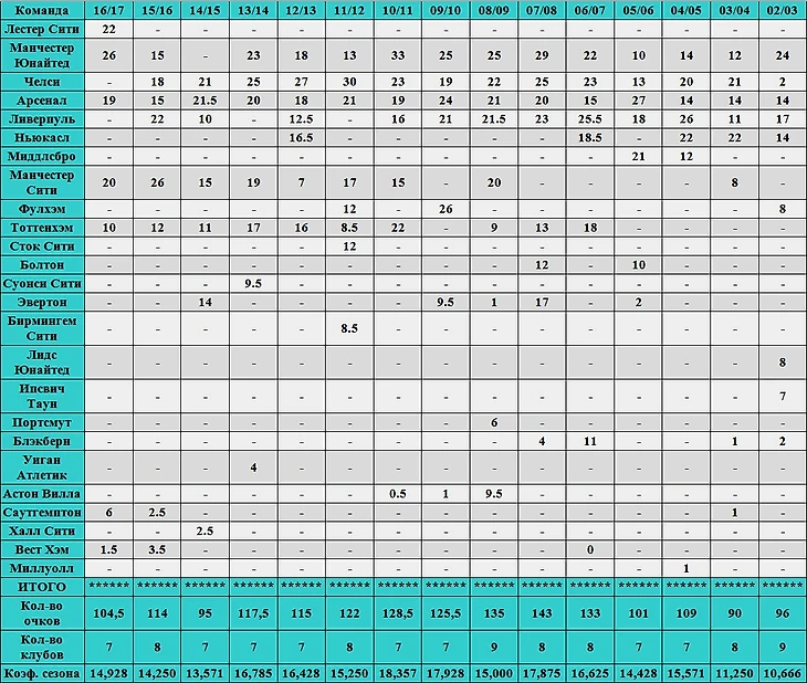 Таблица 2: Количество набранных очков командами в чемпионатах 2002/03-2016/17
